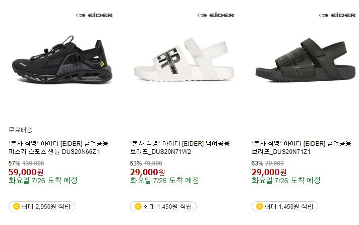 할인 품목 : 샌들, 티셔츠, 팬츠 등