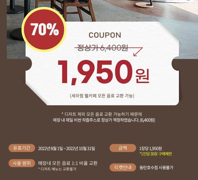 세라젬 웰카페 음료교환권 70% 할인 정보 포스팅입니다.
