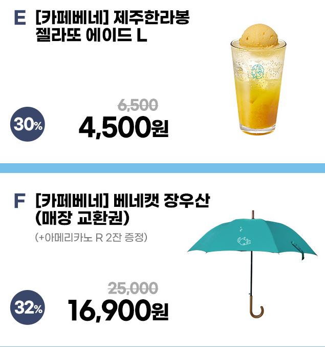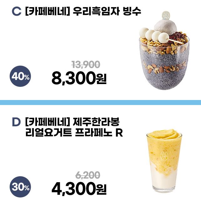 카페베네 다양한 메뉴를 할인 판매하네요.