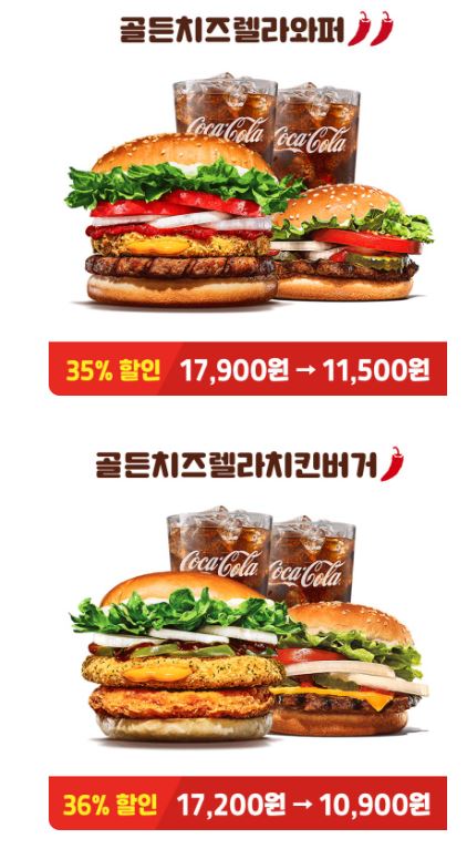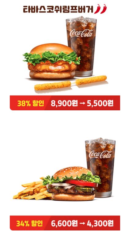 할인 메뉴 : 골든치즈렐라와퍼, 타바스코쉬림프버거 등