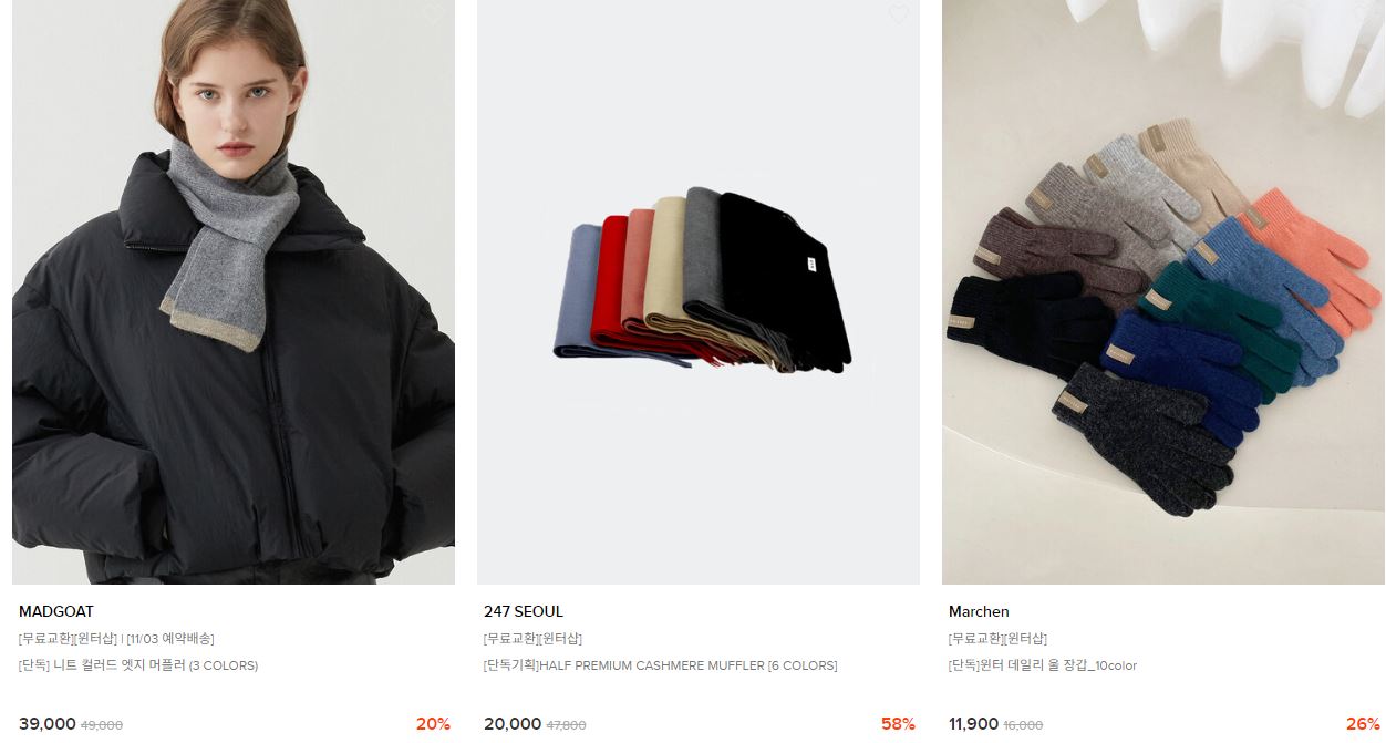 할인 품목 : 니트, 셔츠, 머플러 등