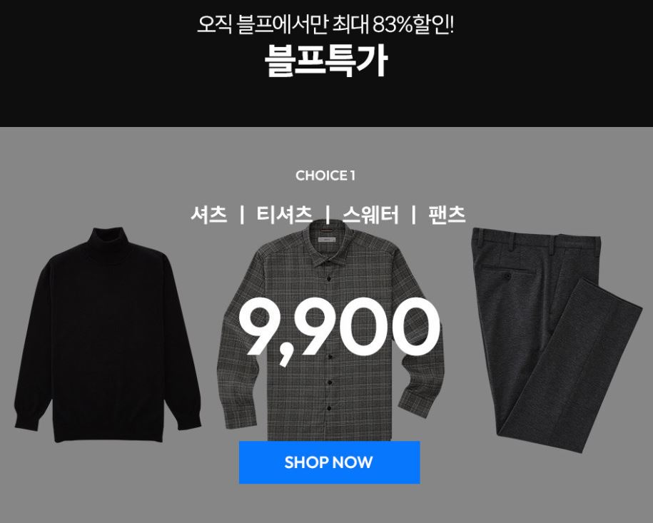 할인 품목 : 티셔츠, 팬츠, 니트 등