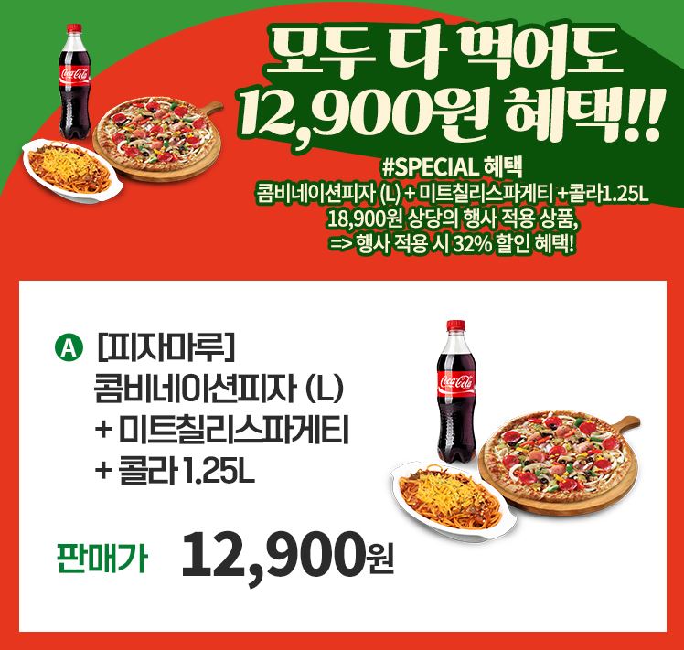 구성 : 콤비네이션피자, 미트칠리스파게티, 콜라