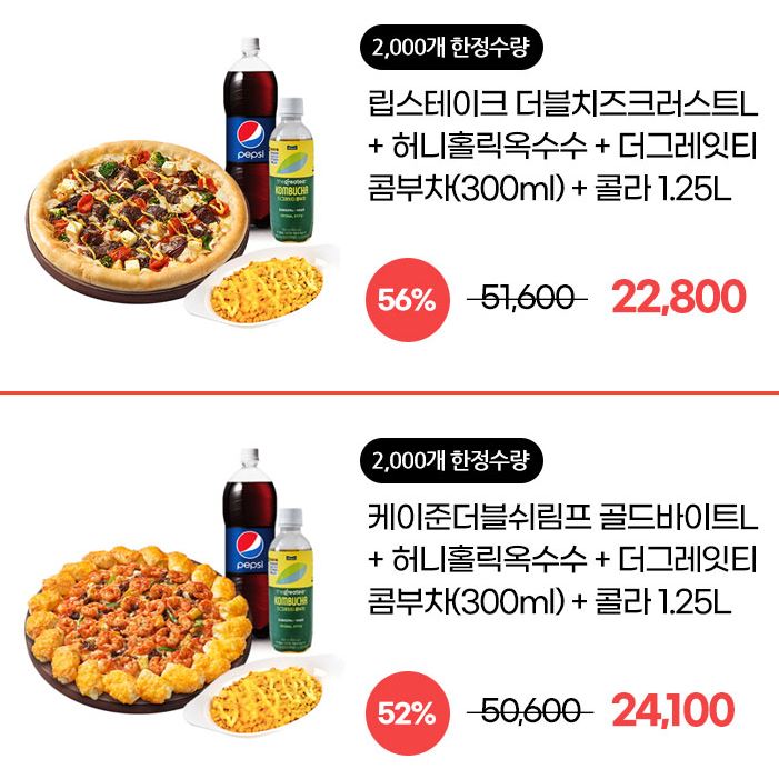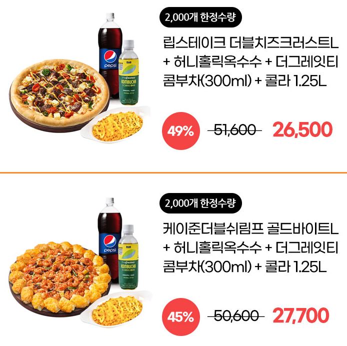 할인 메뉴 : 케이준더블쉬림프 골드바이트, 디트로이트 더블페페로니 등
