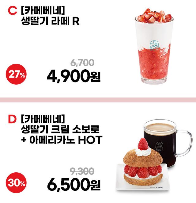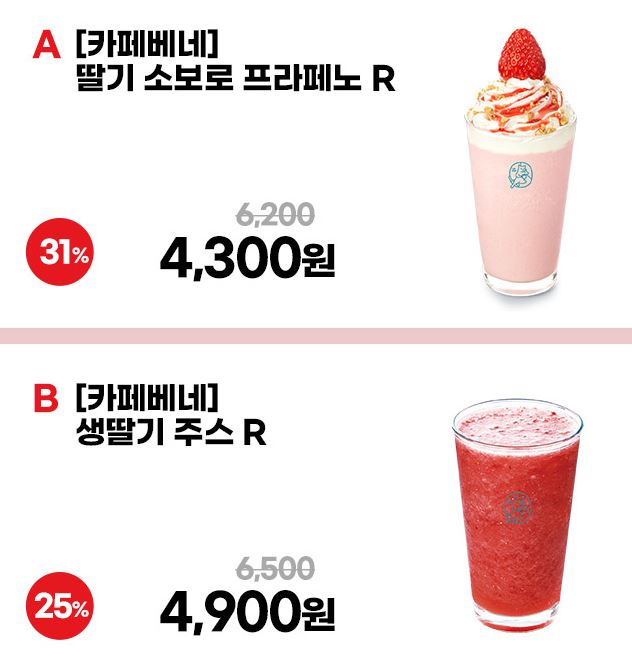 할인 메뉴 : 생딸기 주스, 생딸리 라떼 등