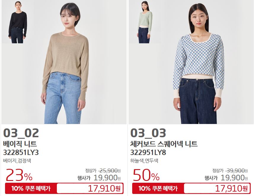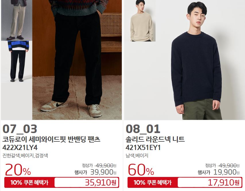 할인 품목 : 팬츠, 티셔츠, 셔츠 등