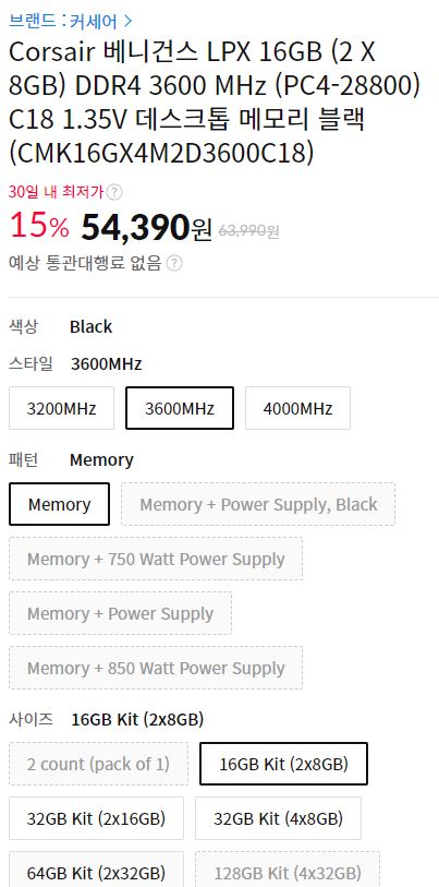 Corsair 베니건스 LPX 16GB DDR4 3600MHz C18을 할인 판매하네요.