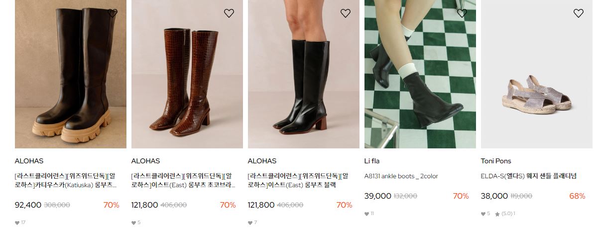 할인 품목 : 샌들, 부츠, 플랫슈즈 등