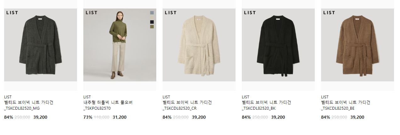 할인 품목 : 티셔츠, 니트, 가디건 등