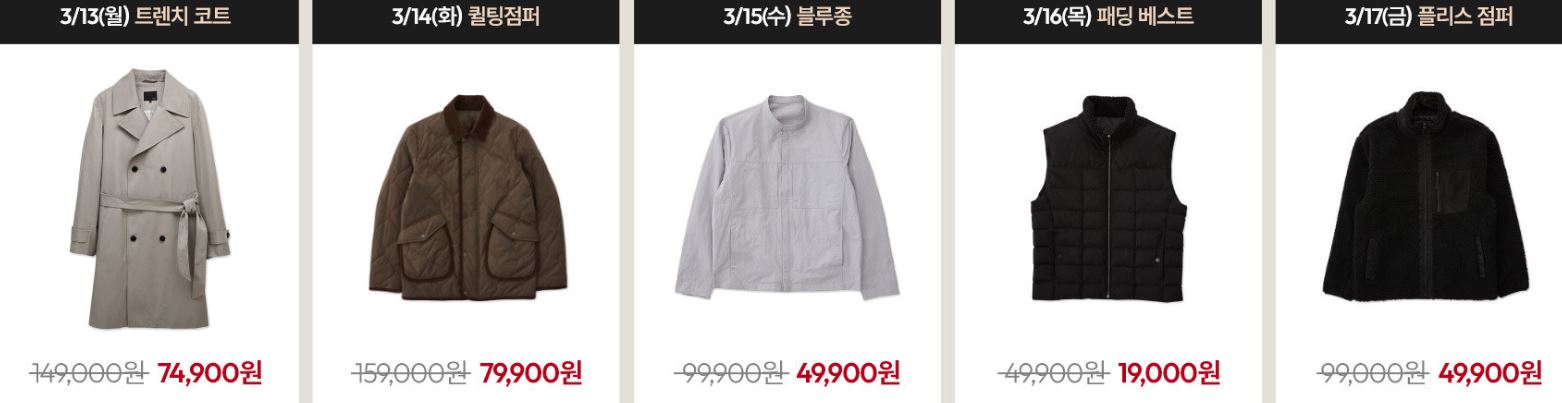 할인 품목 : 자켓, 팬츠, 션츠 등