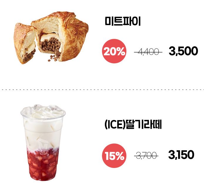 할인 품목 : 레드오렌지자몽주스, 미트파이 등