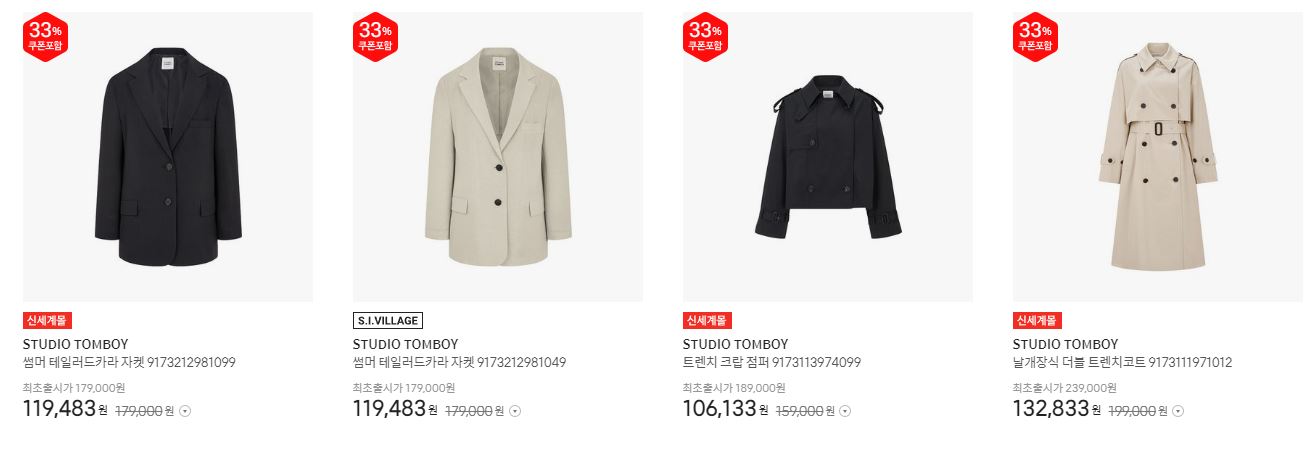 할인 품목 : 자켓, 코트, 티셔츠 등