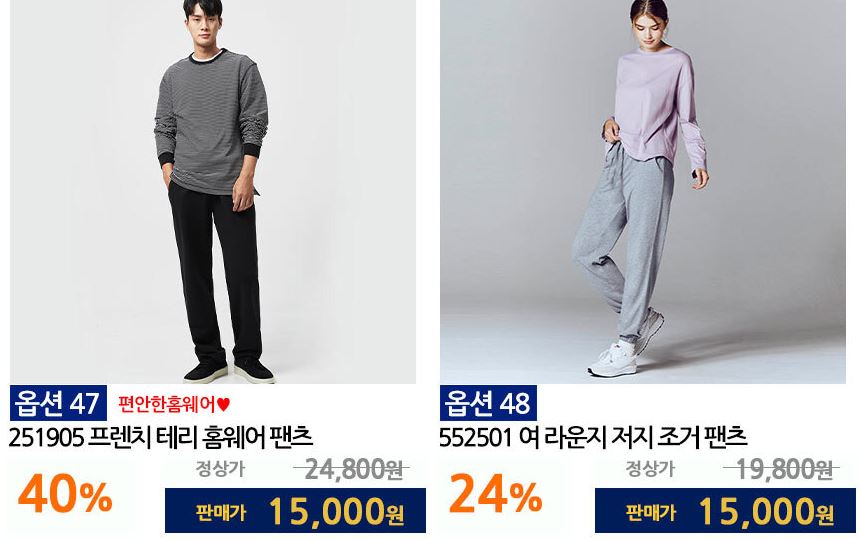 할인 품목 : 티셔츠, 셔츠, 팬츠 등