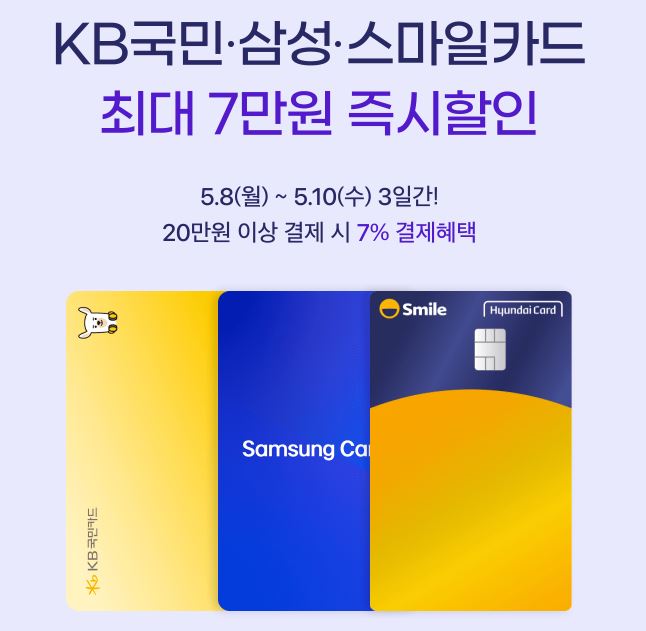 20만원 이상 결제시 KB국민, 삼성, 스마일카드 7% 할인