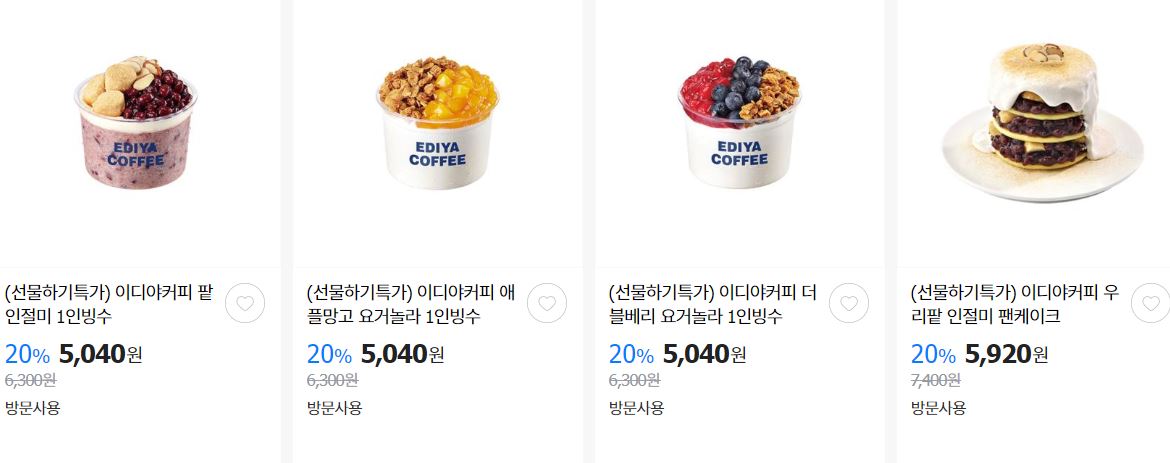 이디야 빙수 다양한 제품을 할인 판매하네요.