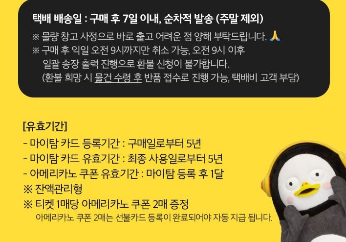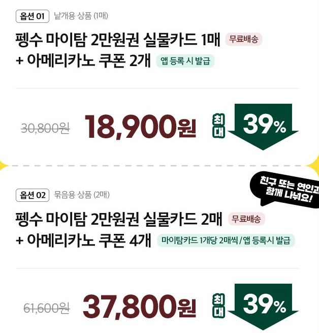 펭수 마이탐 2만원권 2매 + 아메리카노 쿠폰 4개 할인가 37800원