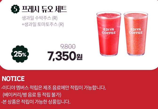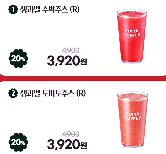 할인 메뉴 : 생과일 수박주스, 생과일 토마토주스 등