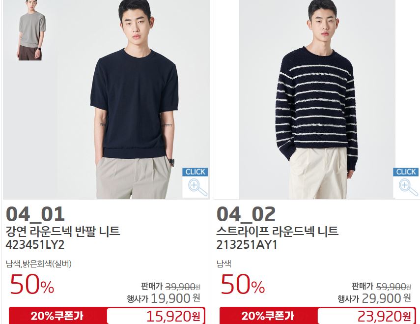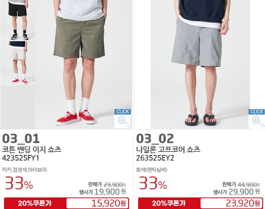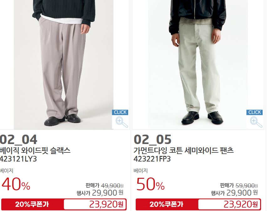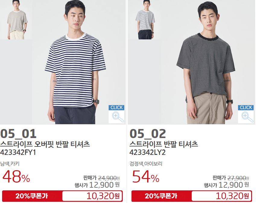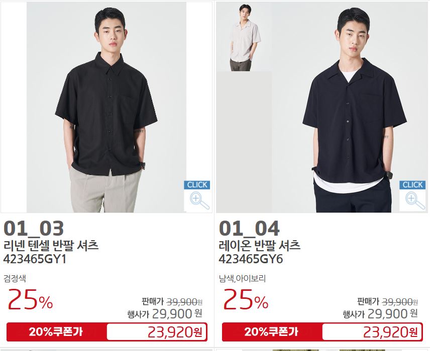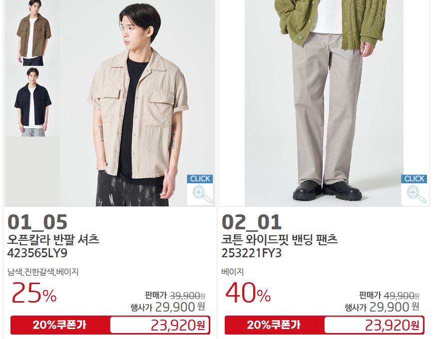 할인 품목 : 티셔츠, 팬츠, 셔츠 등
