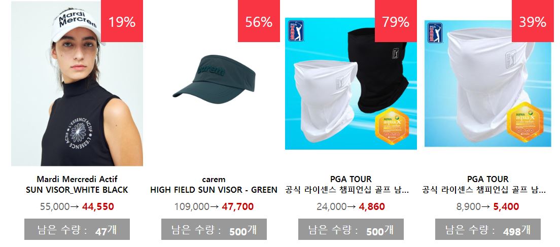 할인 품목 : 골프공, 의류, 모자 등