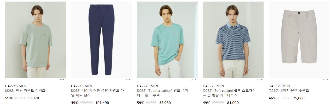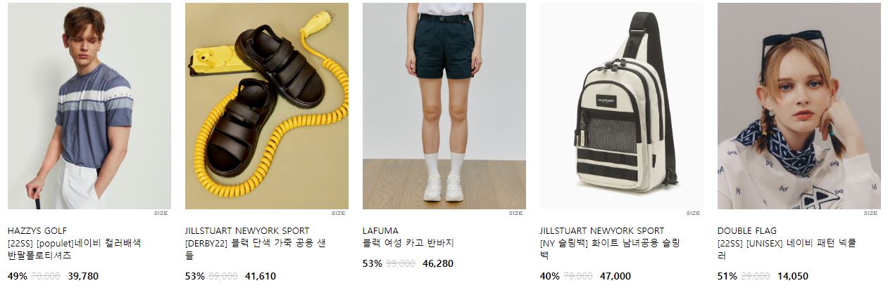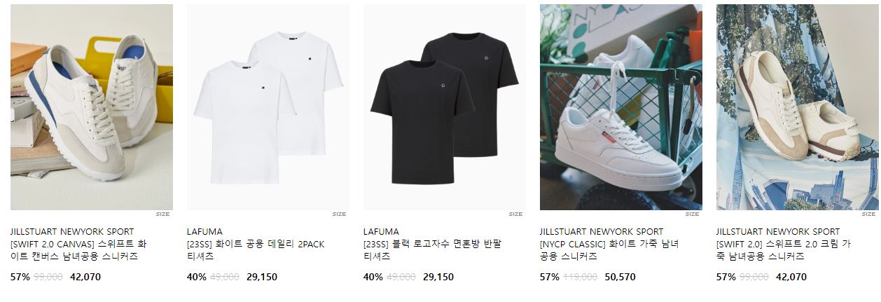 할인 품목 : 티셔츠, 팬츠, 운동화 등