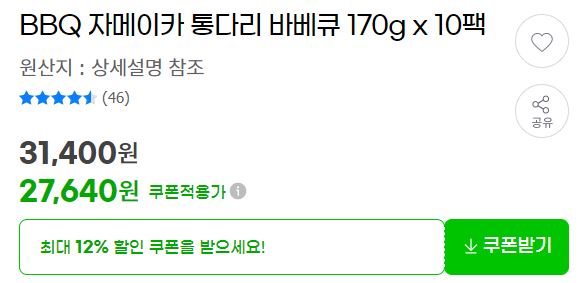 BBQ 자메이카 통다리 바베큐 170g x 10팩을 할인 판매하네요.