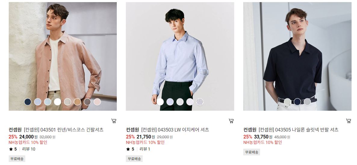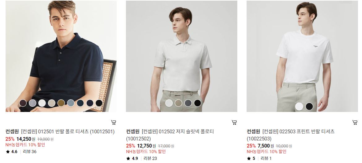 할인 품목 : 팬츠, 티셔츠, 셔츠 등
