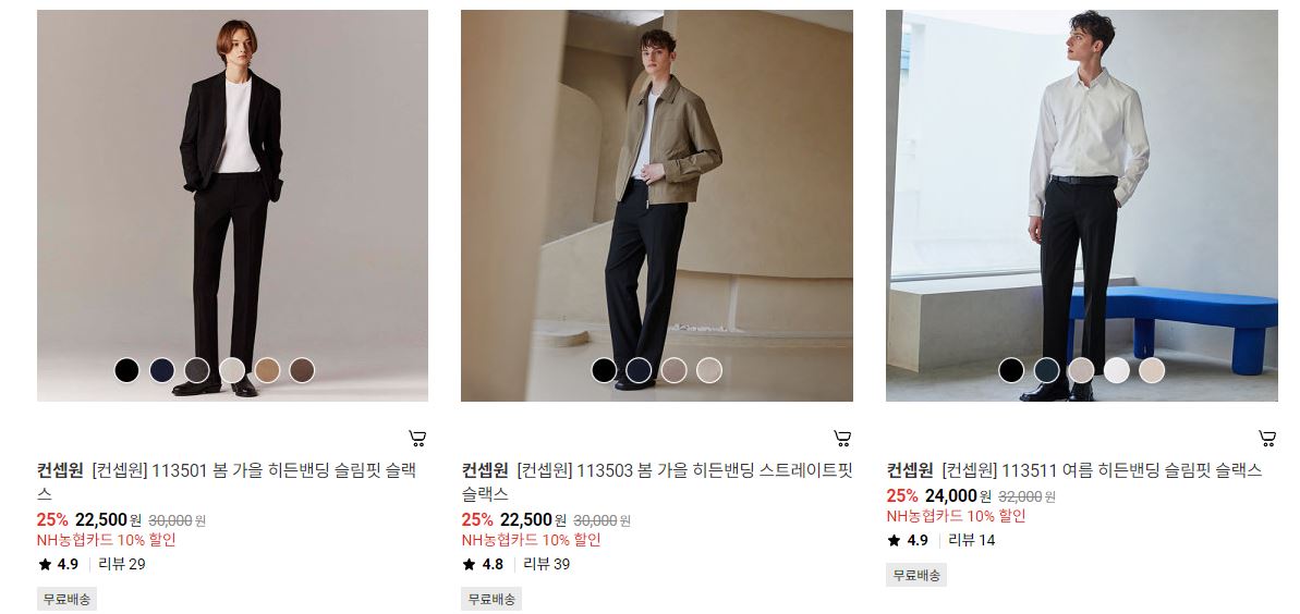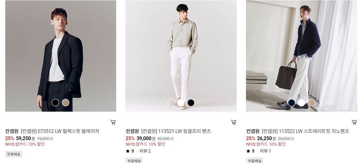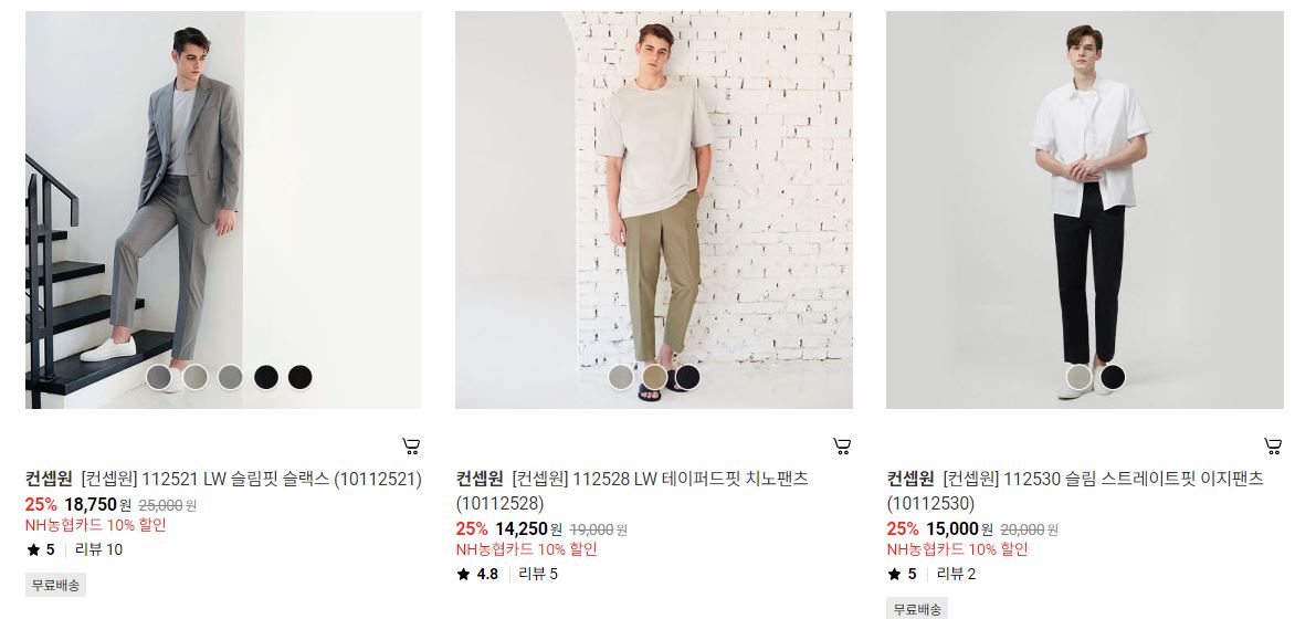 할인 품목 : 팬츠, 티셔츠, 셔츠 등