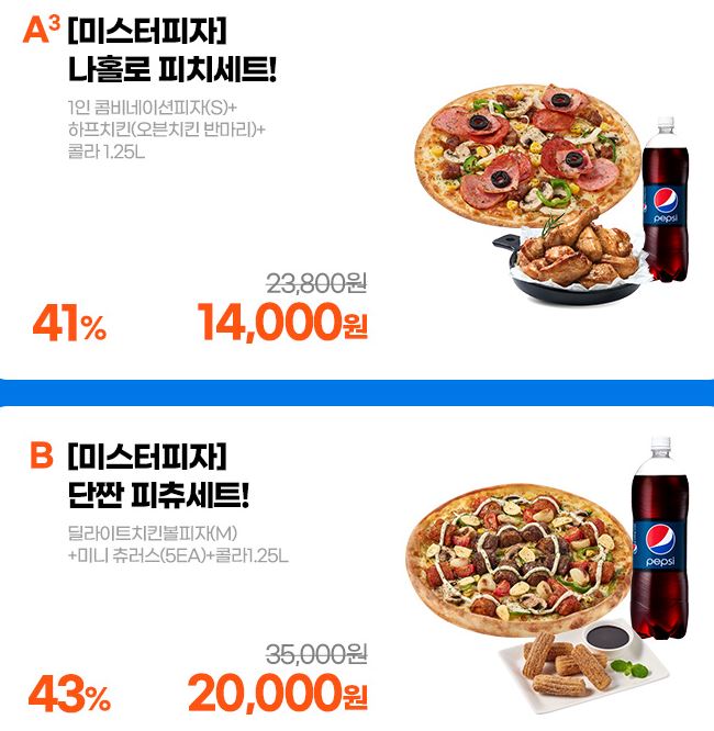 미스터피자 다양한 메뉴를 할인 판매하네요.