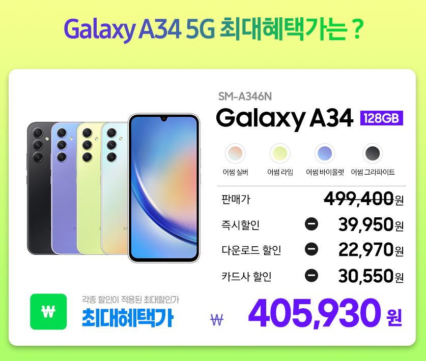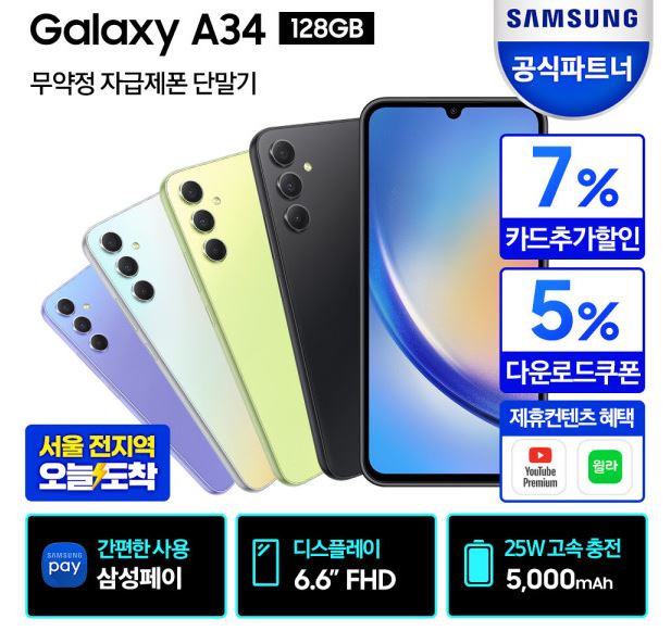 삼성전자 갤럭시 A34 자급제 128GB 할인 정보 포스팅입니다.