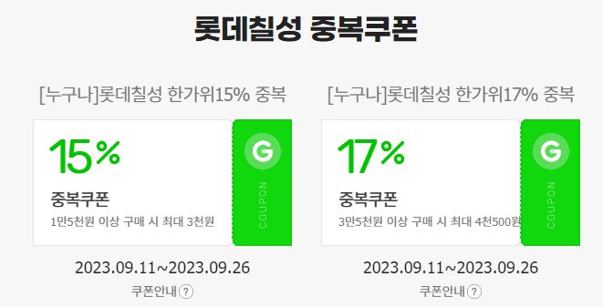롯데칠성 최대 20% 쿠폰 + 최대 17% 중복쿠폰 정보 [링크]