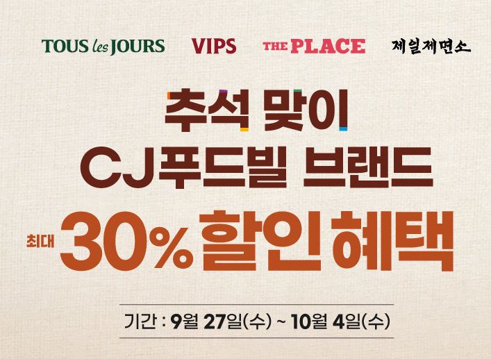 CJ푸드빌 브랜드 추석맞이 최대 30% 할인 정보 [링크]