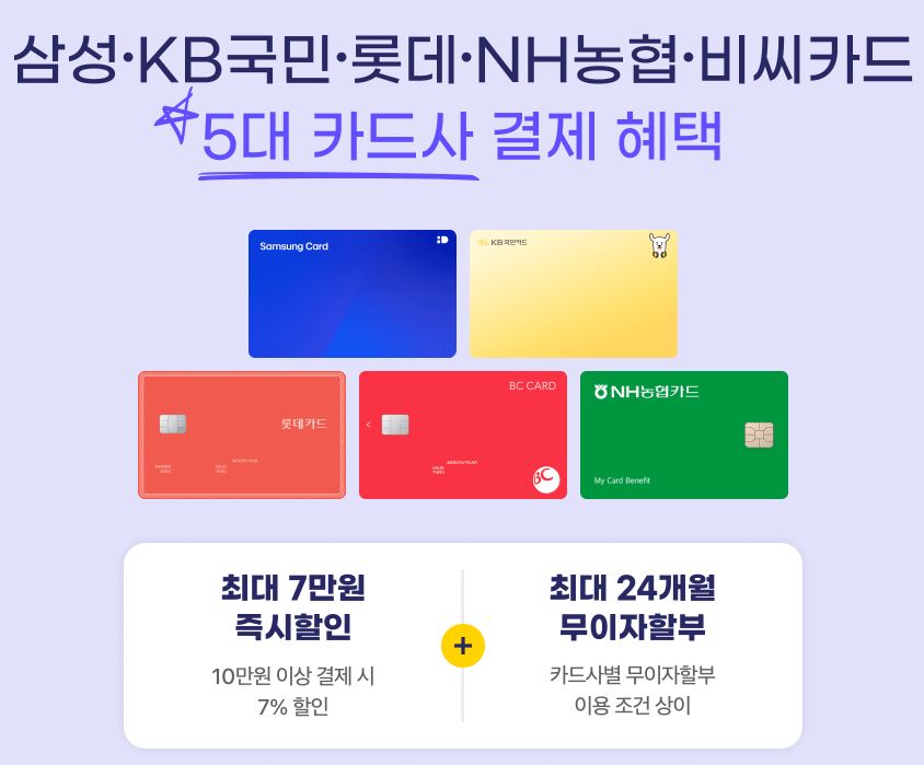 최대 20% 할인 쿠폰, 5대 카드사 7% 할인
