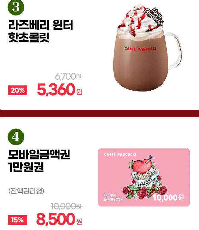 할인 메뉴 : 체리 윈터 드림티, 모바일금액권 등
