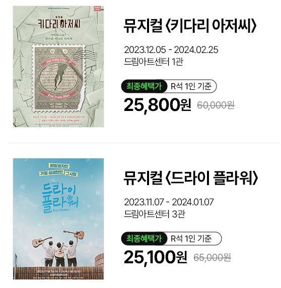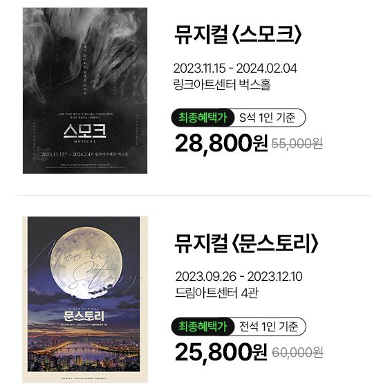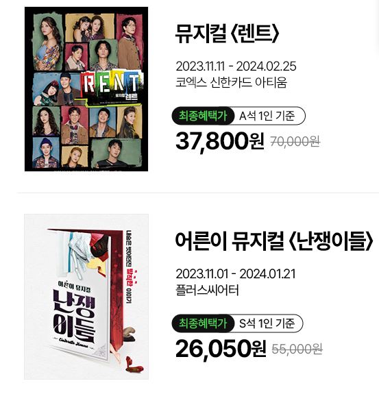 할인 품목 : 뮤지컬, 연극, 전시 등