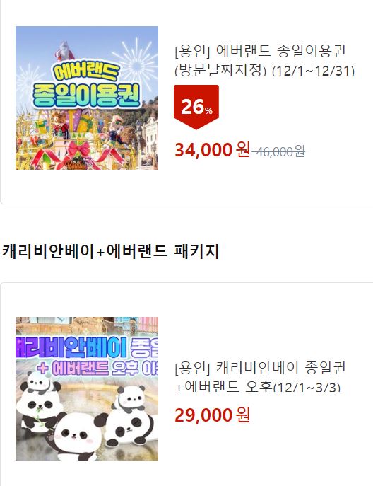 캐리비안베이 종일권 + 에버랜드 오후권 가격 29000원