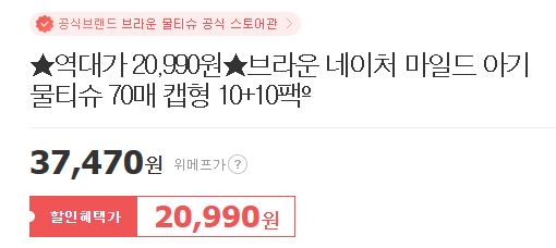 브라운 네이처 마일드 아기물티슈 70매 캡형 10+10팩 할인 정보 포스팅입니다.