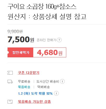 구이요 소곱창 160g+참소스 할인 판매하네요.