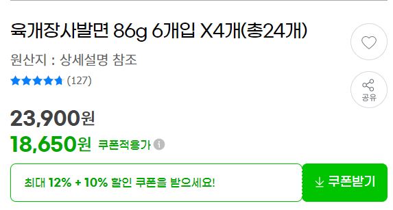 농심 육개장사발면 86g 24개을 할인 판매하네요.