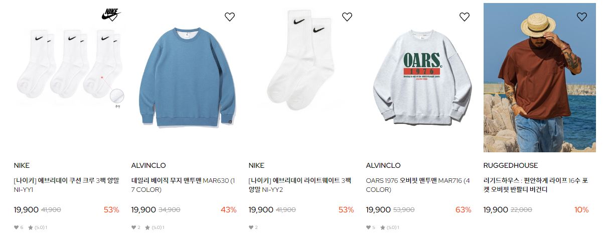 할인 품목 : 티셔츠, 팬츠, 양말 등