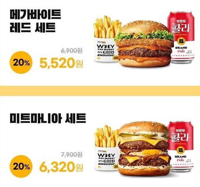 할인 메뉴 : 코울슬로치킨버거세트, 미트마니아세트 등