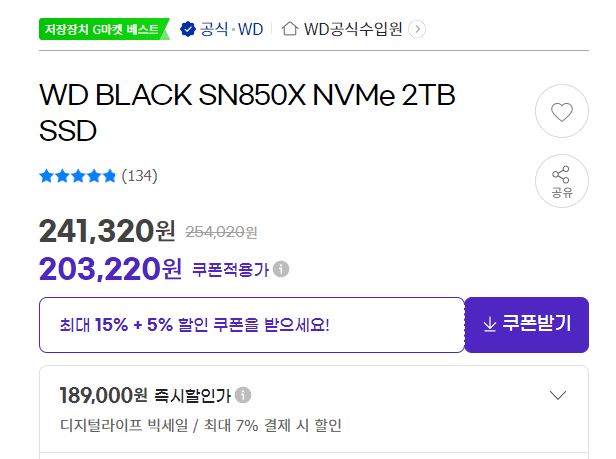 WD BLACK SN850X NVMe 2TB SSD 할인 정보 [링크]