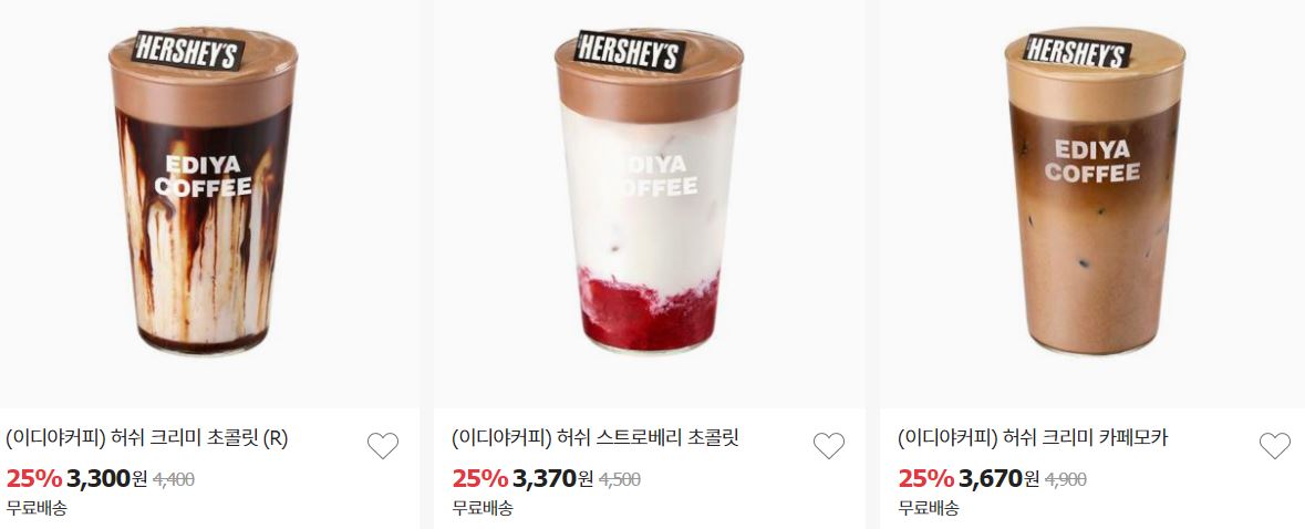 이디야커피X허쉬 다양한 메뉴를 할인 판매하네요.