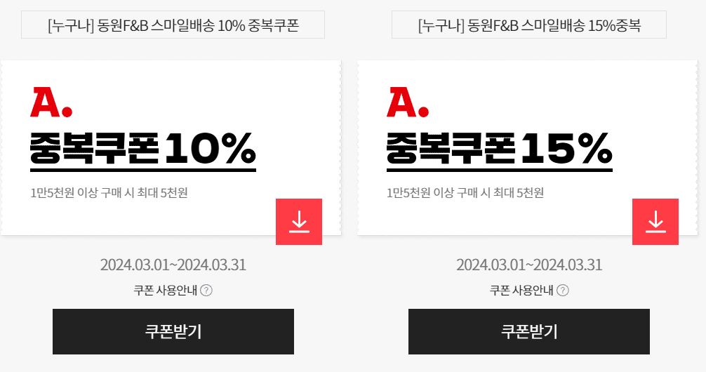 동원 15% 중복쿠폰 + 카드 10% 즉시할인 정보 [링크]