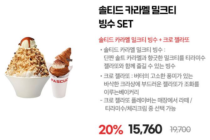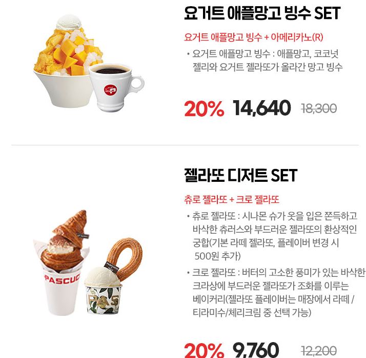 할인 메뉴 : 젤라또 레드빈 빙수 세트, 모바일상품권 등