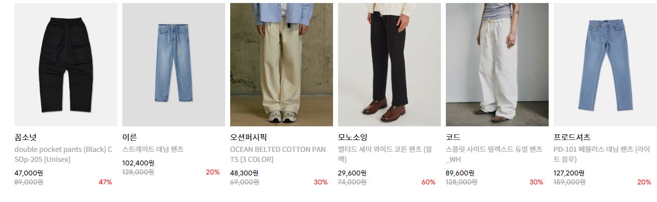 할인 품목 : 티셔츠, 팬츠, 신발 등