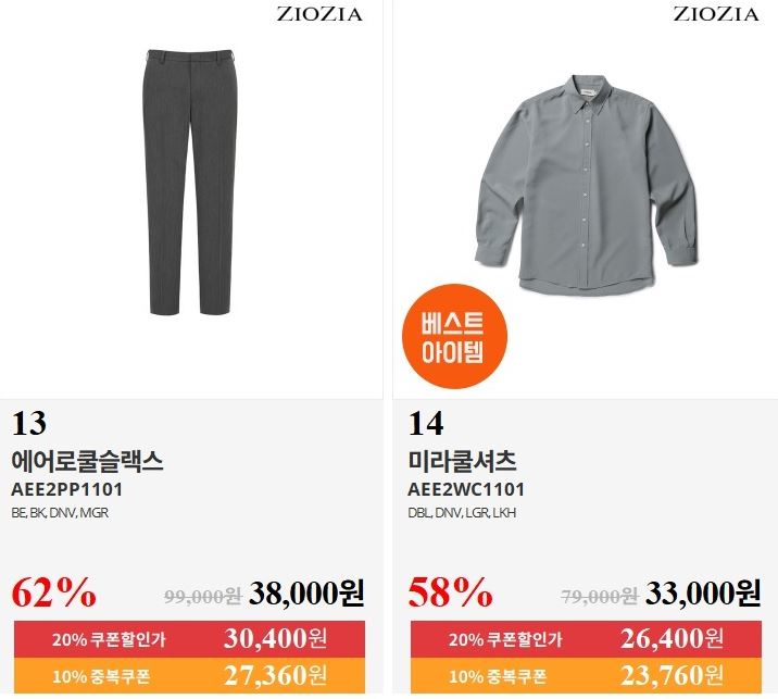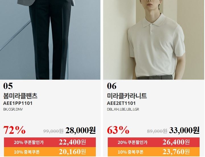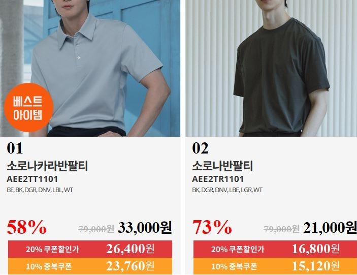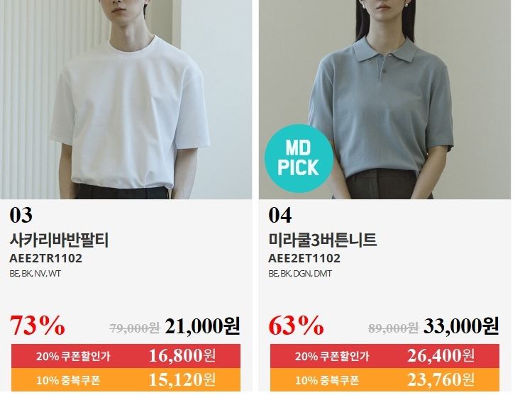 할인 품목 : 티셔츠, 팬츠, 셔츠 등