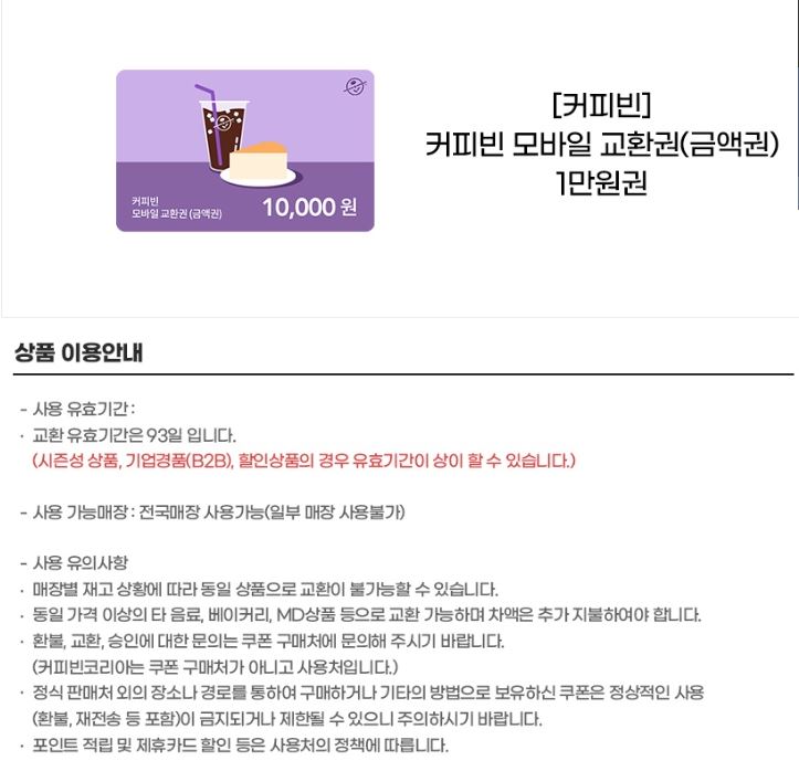 커피빈 금액권 1만원권 13% 할인 정보 [링크]