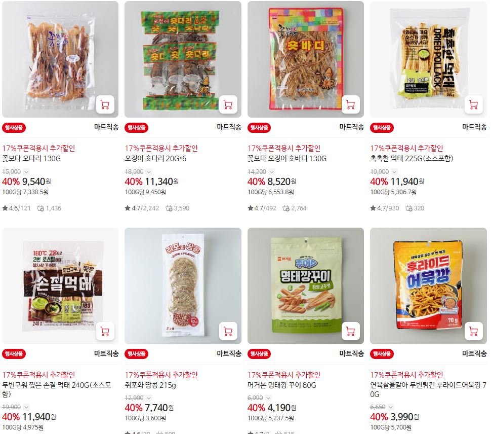 할인 품목 : 오징어, 쥐포, 꽃게 등