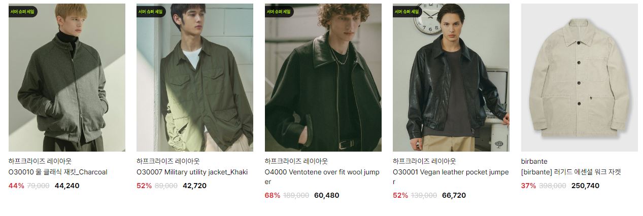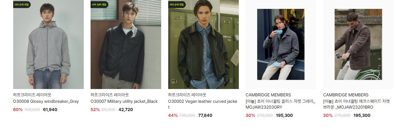 할인 품목 : 점퍼, 코트, 티셔츠, 팬츠 등