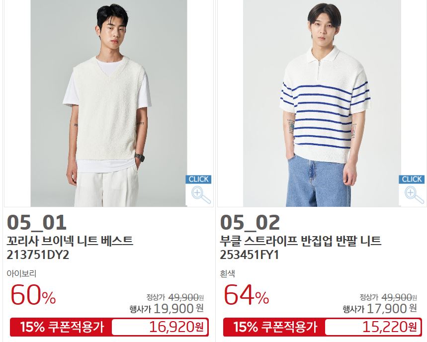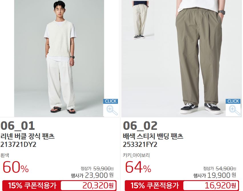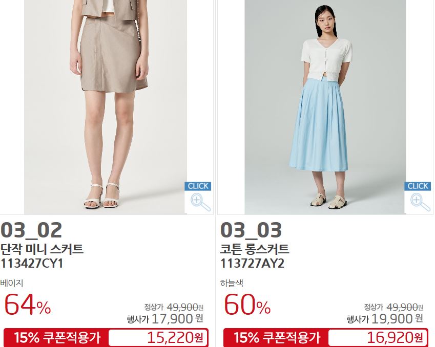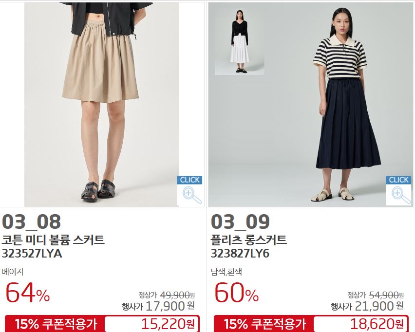 할인 품목 : 티셔츠, 팬츠, 스커트 등
